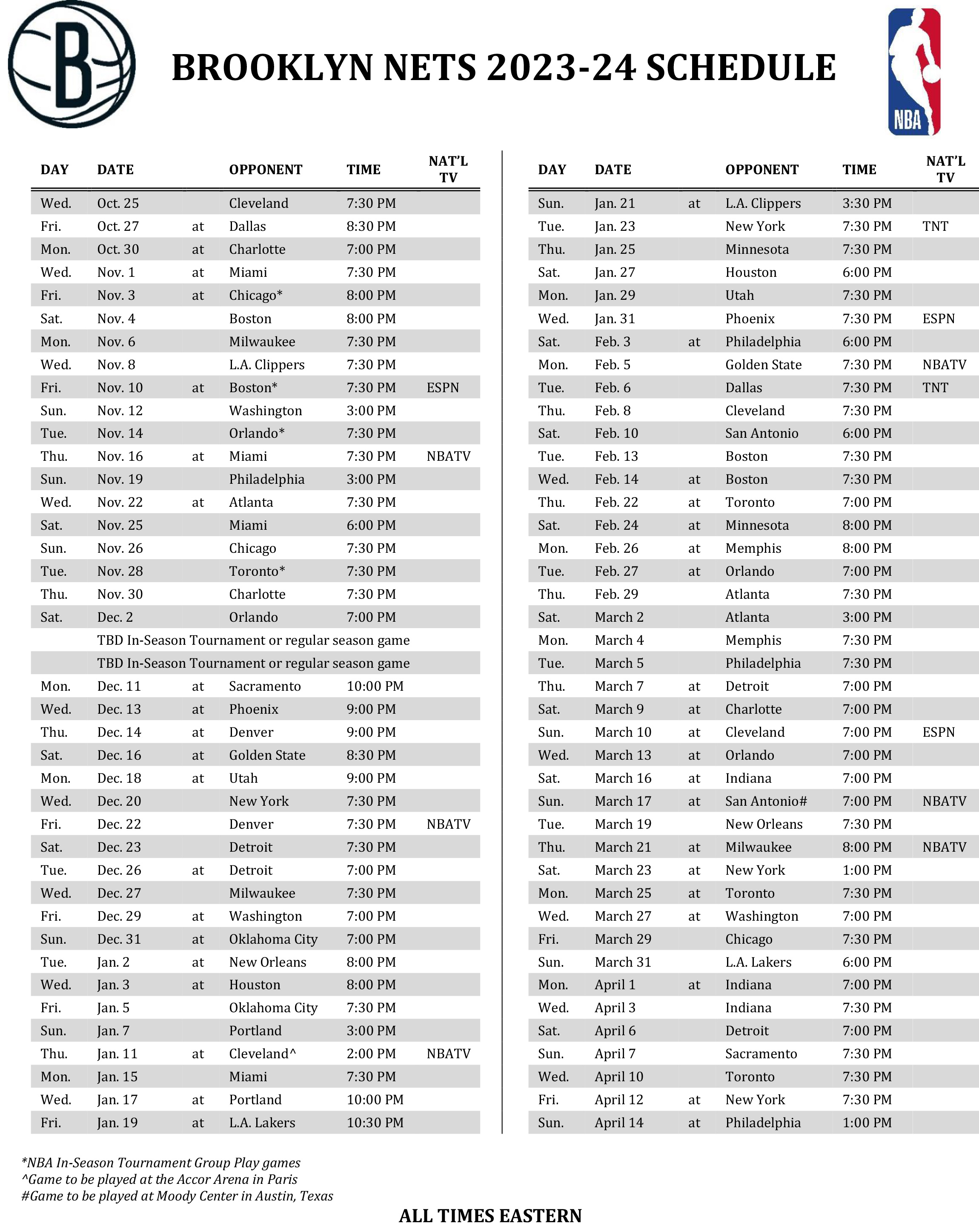 Calendrier de la saison 2023/2024 de Brooklyn